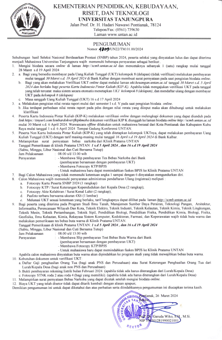 Sehubungan hasil Seleksi Nasional Berdasarkan Prestasi (SNBP) tahun 2024 seperti dilansir scmb.untan.ac.id pada Selasa (26/3).
